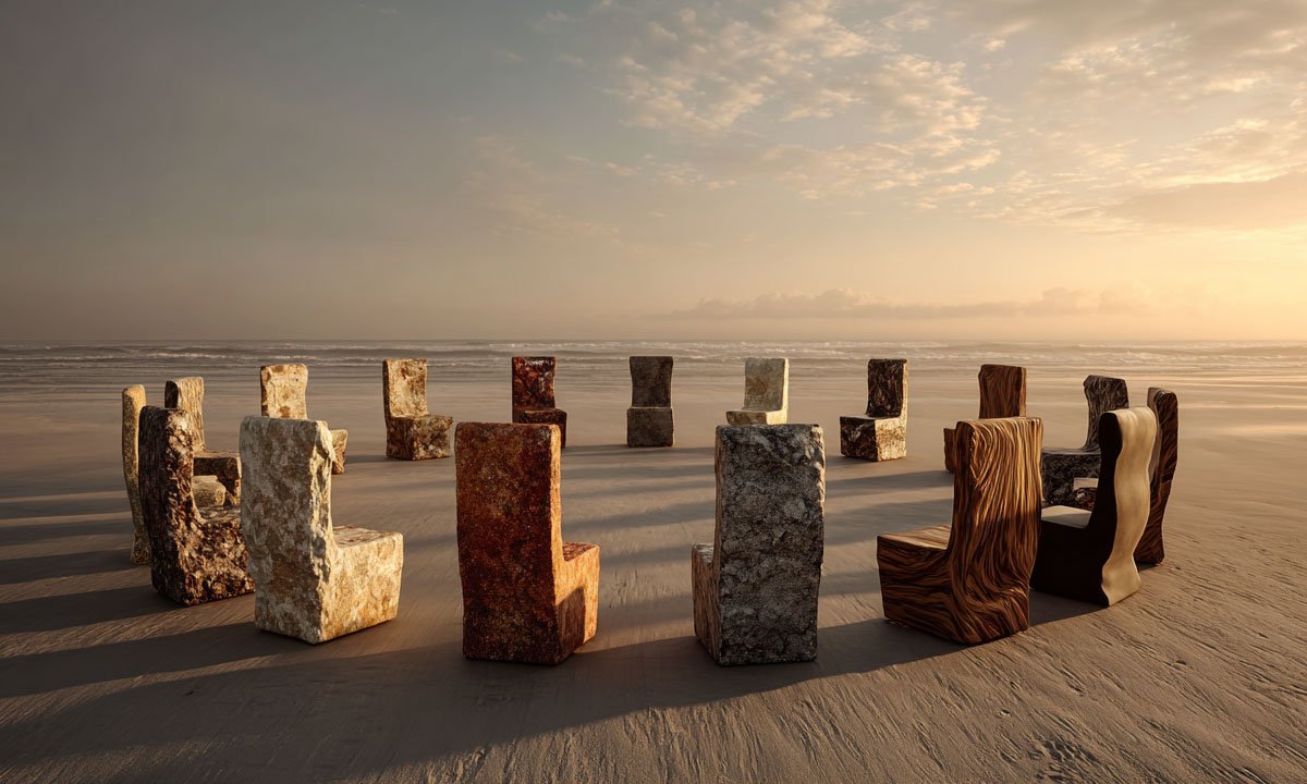 Rattan, teak, travertine, mineral finishes—tactile, timeless, durable.